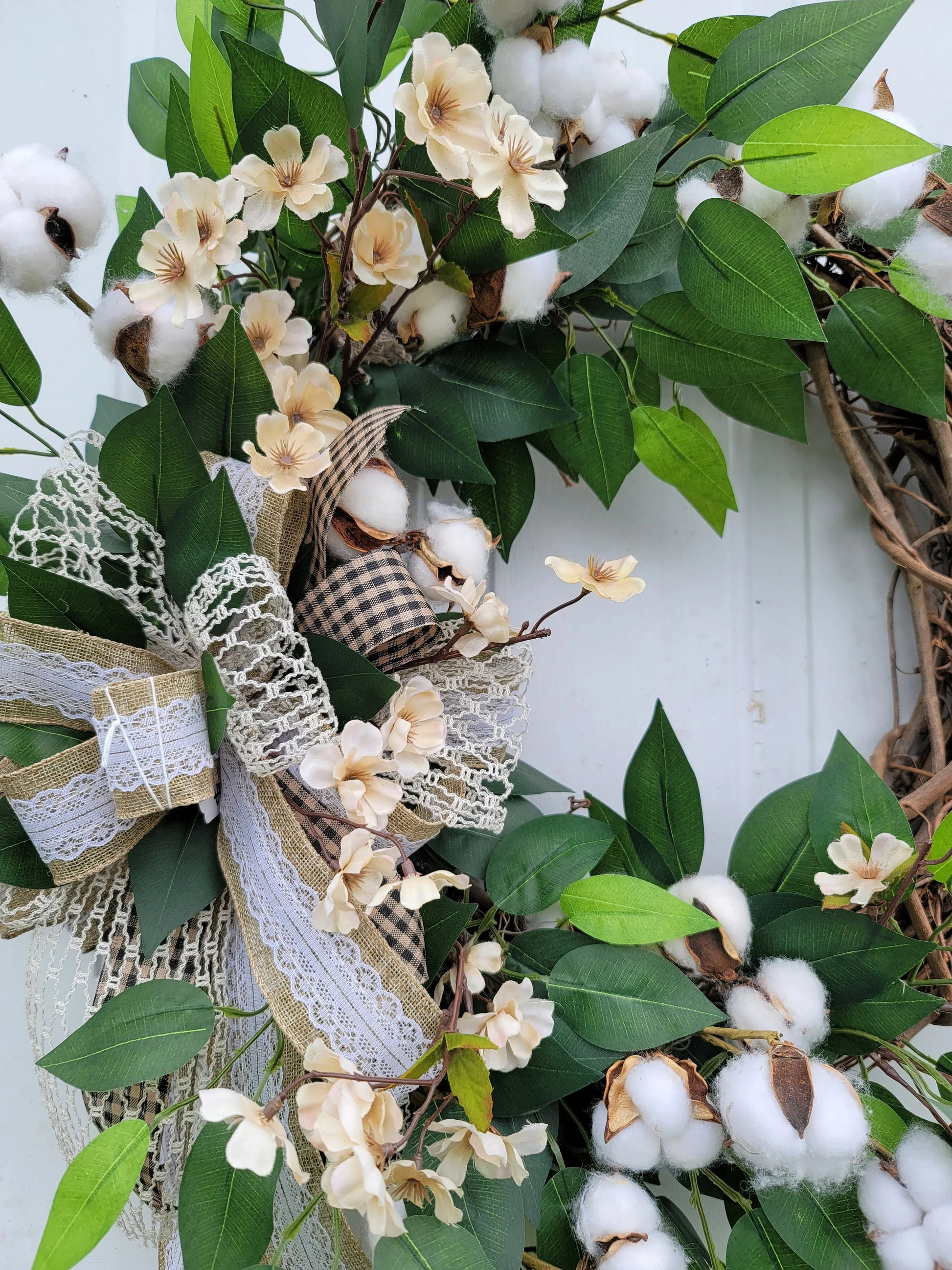 The base is an 18" grapevine and embellished with quality ribbon, cottonwood stems and greenery. Item measures: H24"x W22"x D 8".