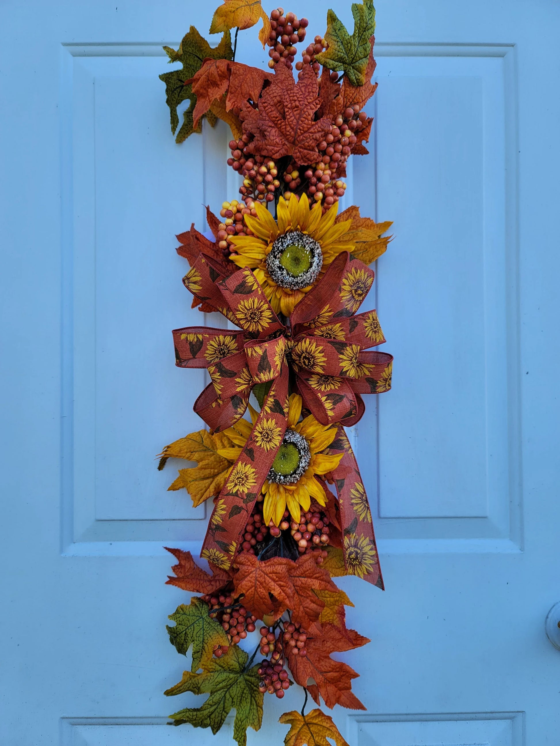 This swag is embellished with yellow silk sunflowers, fall colored leaves and greenery. Measures: H32”x W8”x D5”