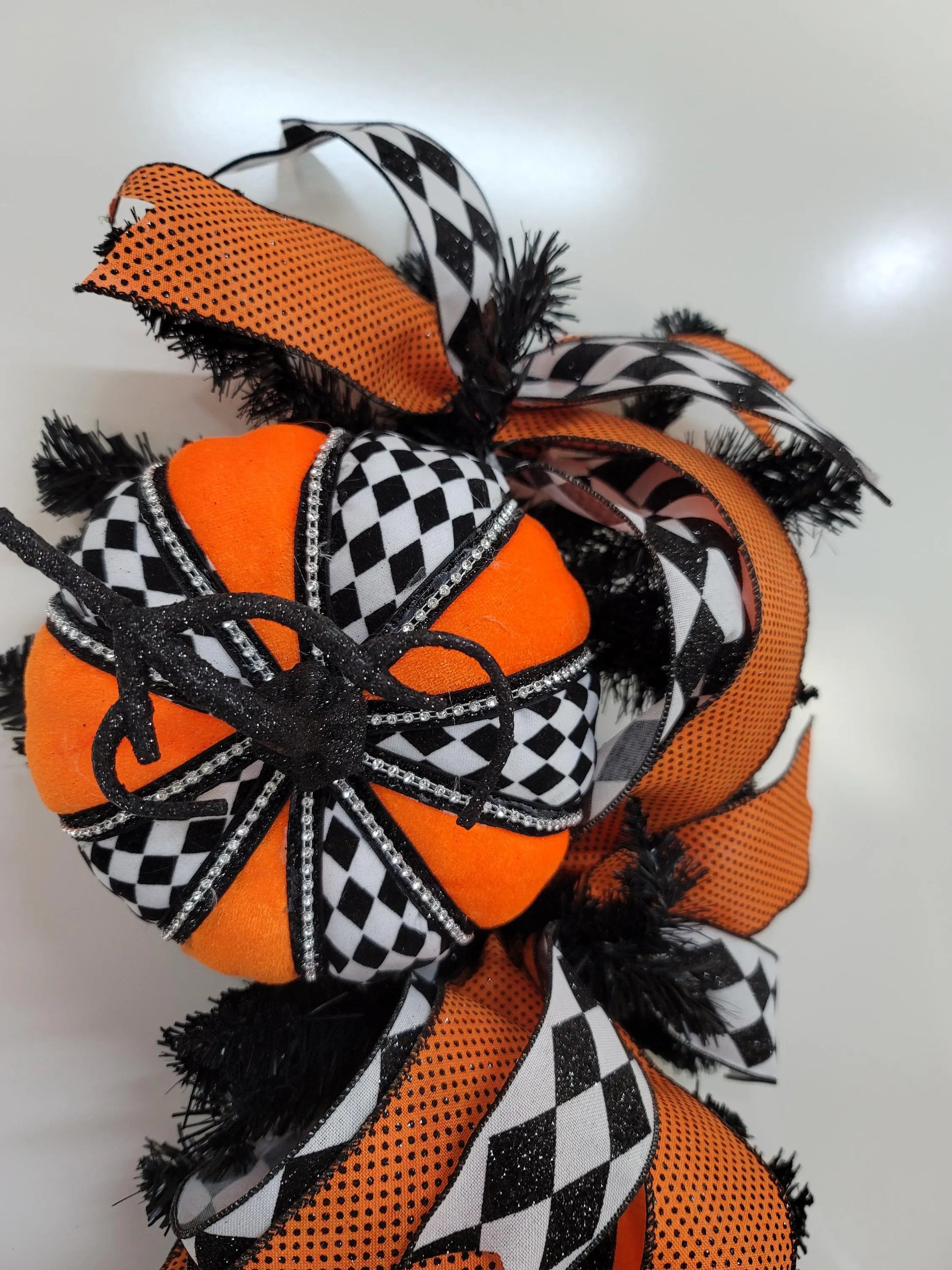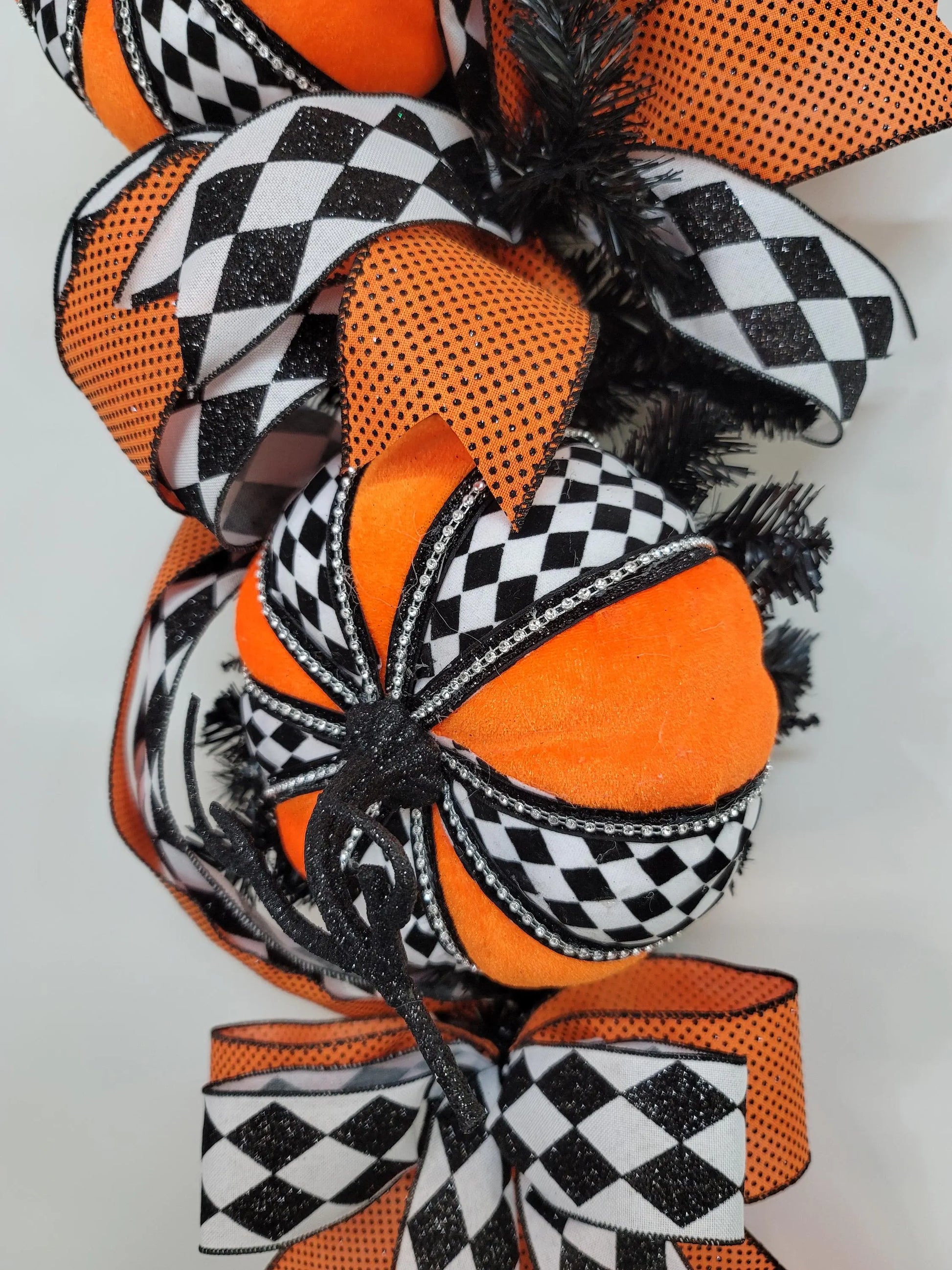 The base is black evergreen and the embellished are: pumpkins that are made with orange, black and white fabric and black and white harlequin and orange polka dot wired ribbon. Measurements: H40"xW15"xD10".