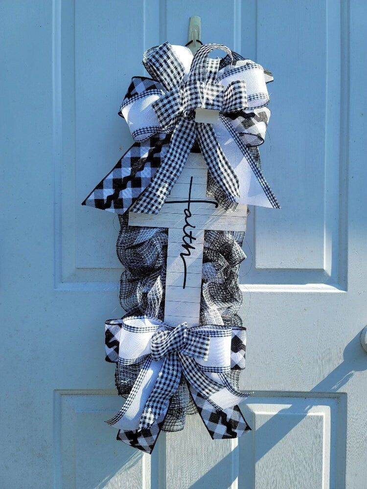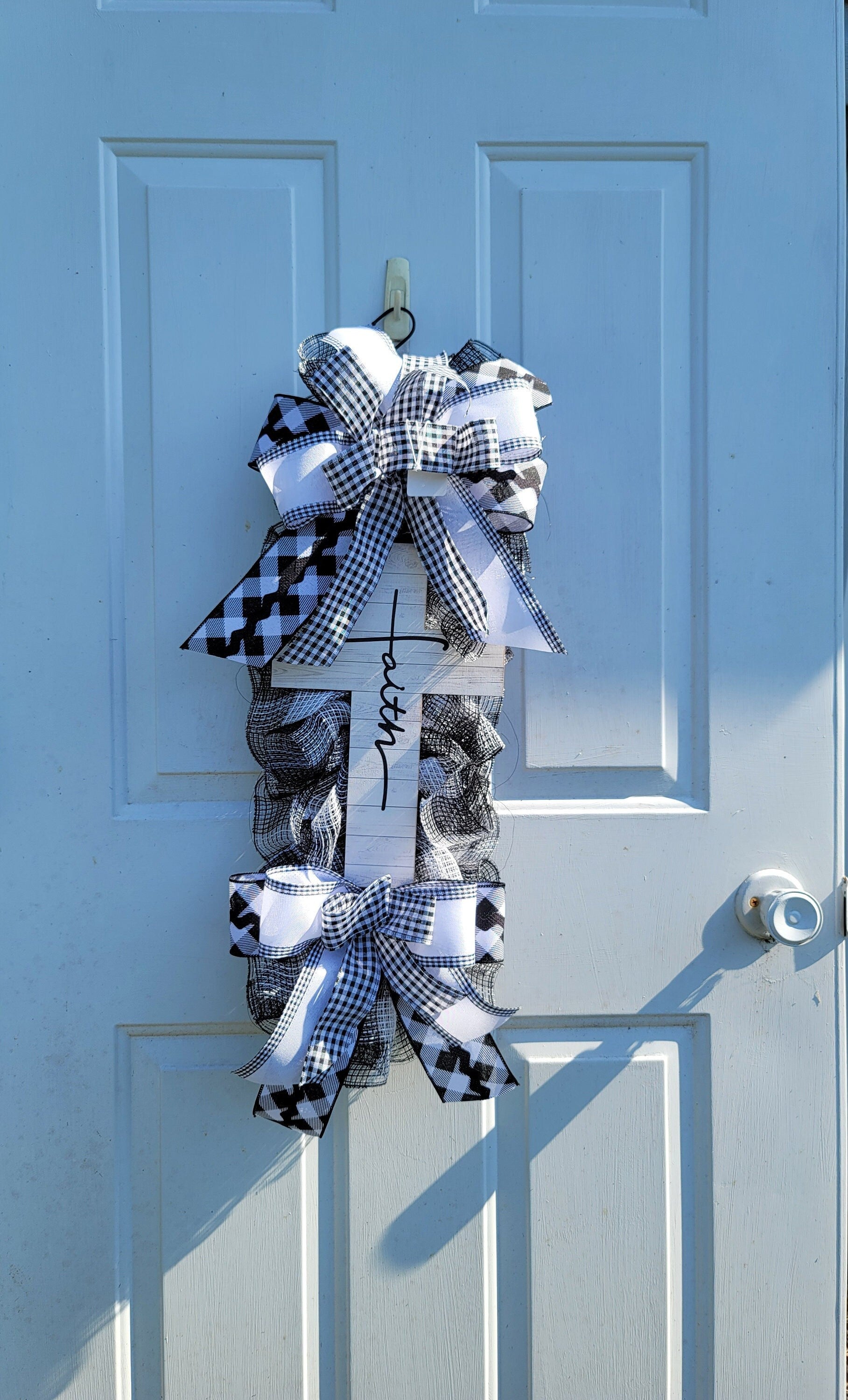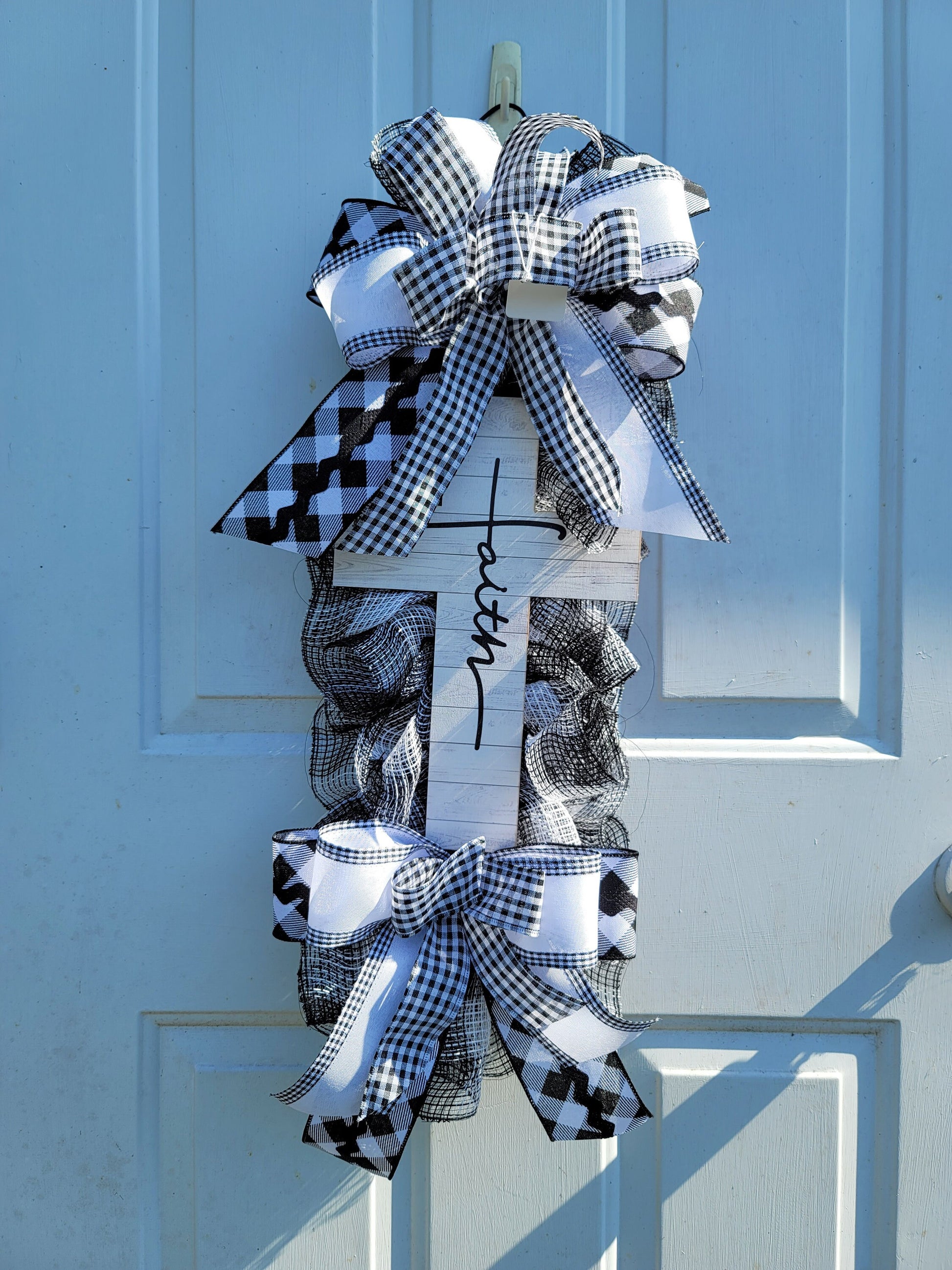 The wooden cross reads "Faith" and it's embellished with deco mesh and ribbon. This swag measures: H24"x W12" x D4"